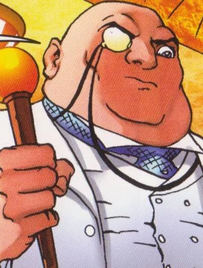 Pinn is described as bald and fat and often wears a white suit. He also carries a cane around with him, which he used to fire Plasms and other spells.